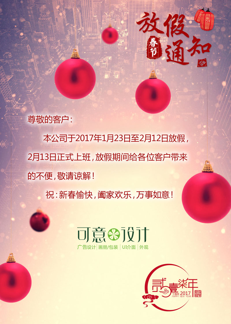 尊敬的各位客戶:公司于2017年1月23日至2月12日放假,2月13日正式上班,